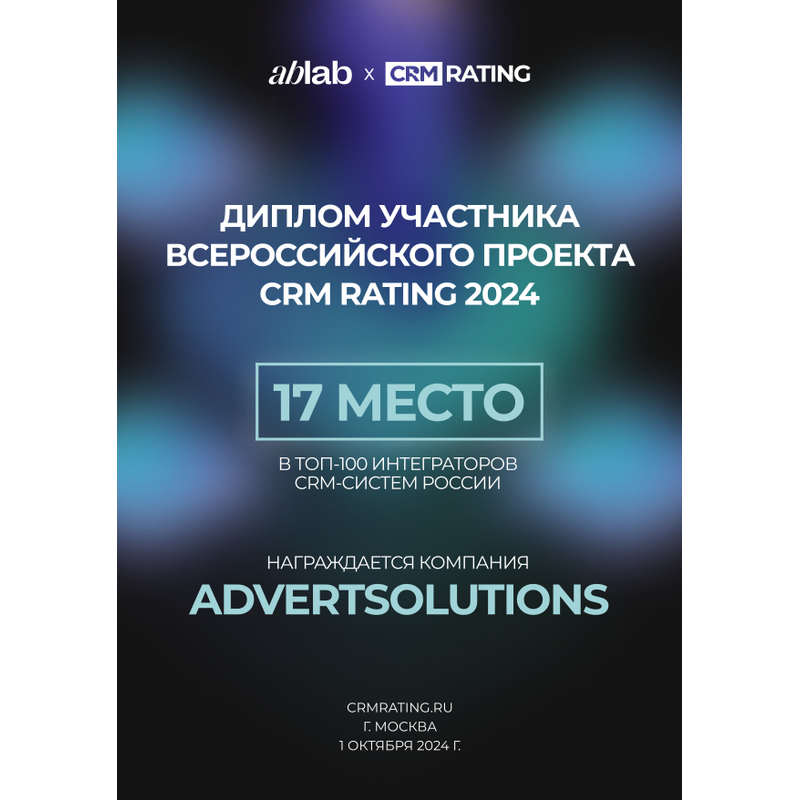 Компания AdvertSolutions, является основателем Ассоциации "Гильдия интеграторов". По итогам рейтинга, больше 10 членов Гильдии интеграторов вошли в ТОП-20 рейтинга CRM-интеграторов России.